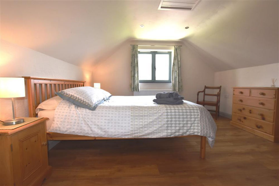 The MASTER BEDROOM has a king size bed, painted pine wardrobe and chest of drawers. It has lovely views down the valley.
